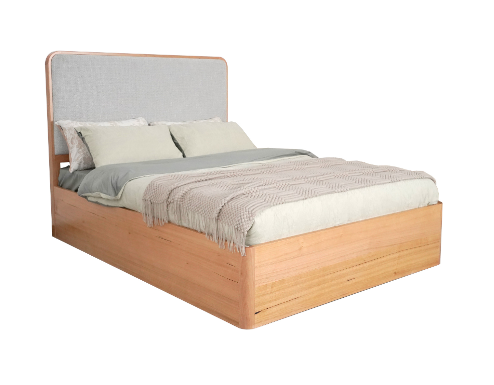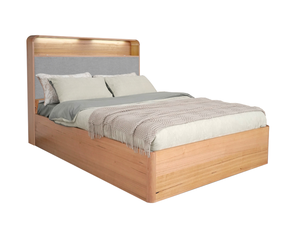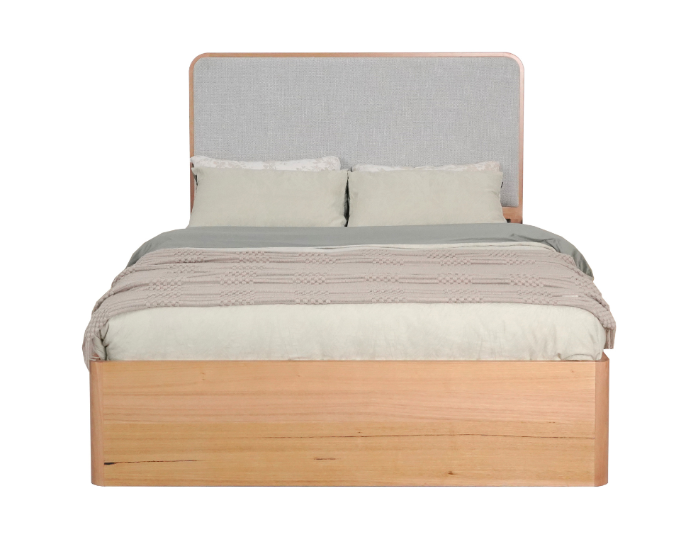 Torvi Gaslift Bed Frame –Messmate Veneer with Upholstered Headboard
